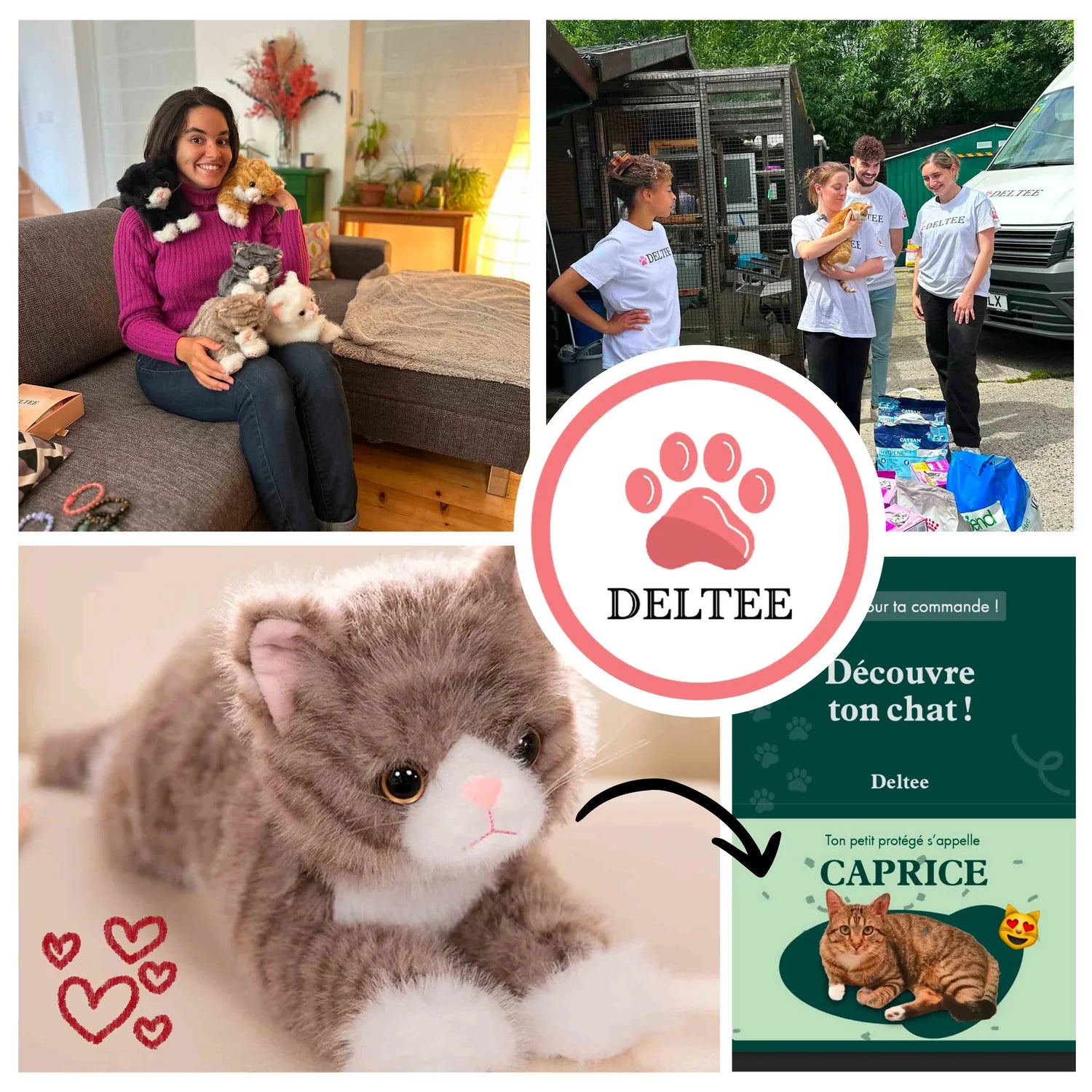 Les dons aux associations : chaque commande permet à Deltee de remettre des dons (nourriture, litière, matériel) aux refuges partenaires partout en France. Depuis plus de 4 ans, notre équipe s’est rendue aux quatre coins du pays pour soutenir concrètement les associations, et nous comptons bien continuer.